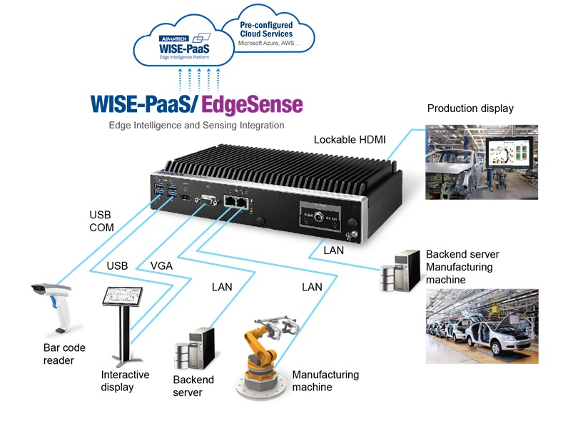 在裝配設(shè)施的每個工作站,配有合適電源、LAN 和 HDMI 接口的研華 ARK-2250 均被安裝于機械手臂并連接支持可鎖線纜設(shè)計的電源、網(wǎng)絡(luò)、監(jiān)控傳感器,從而防止任何線纜或電纜脫落而導(dǎo)致生產(chǎn)故障或中斷。為啟用數(shù)據(jù)采集、數(shù)據(jù)顯示和遠程監(jiān)控功能,ARK-2250 及后端服務(wù)器都已部署研華 IoT WISE-PaaS/RMM 軟件平臺。