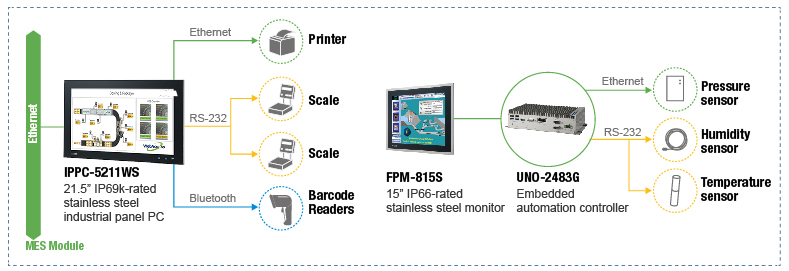 ▌▌研華方案研華科技提出了一個解決方案,包括一個內(nèi)部系統(tǒng)監(jiān)控稱重過程和一個外部系統(tǒng)監(jiān)控稱重室環(huán)境。內(nèi)部監(jiān)控系統(tǒng)選用研華的IPPC-5211WS多點觸控工業(yè)平板電腦為工作站外設(shè)(即工作站外設(shè))提供藍(lán)牙、RS-232、以太網(wǎng)連接(例如條形碼掃描器、刻度和打印機(jī))。IPPC-5211WS采用了21.5 英寸全高清顯示屏,16:9寬屏幕,不銹鋼設(shè)計,7H表面硬度,IP96K防護(hù)等級,使其成為潔凈室應(yīng)用的理想選擇。 對于外部監(jiān)控系統(tǒng),研華提出了UNO-2483G嵌入式自動化控制器和FPM-8151H工業(yè)監(jiān)控解決方案。UNO-2483G控制器具有緊湊無風(fēng)扇設(shè)計,優(yōu)秀的處理能力(第四代Intel® Core™ i7/i3/Celeron 1.9GHz),內(nèi)置內(nèi)存(4/8 GB DDR3L RAM)和多種接口 (4 x GbE, 4 x USB 2.0/3.0, 2 x RS-232, 2 x RS-422/485, 1 x VGA, 1 x HDMI, and 1 x audio)。FPM-8151H顯示器具有15英寸XGA液晶顯示器與LED背光。前面板防塵防水等級為IP65,和IPPC-5211WS一樣,它也采用不銹鋼設(shè)計,特別適合潔凈室環(huán)境。