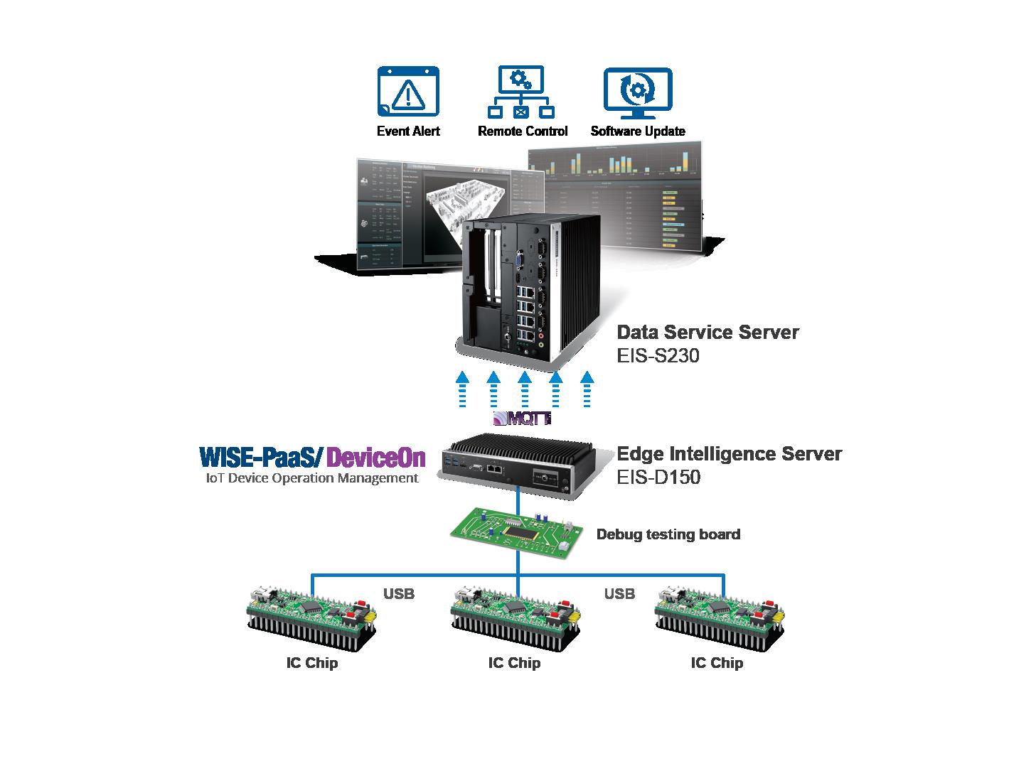 本案客戶(hù)在測(cè)試生產(chǎn)線(xiàn)上共構(gòu)建了數(shù)百臺(tái)邊緣智能服務(wù)器EIS-D150,各自連接到不同芯片測(cè)試設(shè)備,數(shù)據(jù)上傳中控室數(shù)據(jù)管理服務(wù)器EIS-S230進(jìn)行集中式管理監(jiān)督,EIS-S230基于容器與微服務(wù)構(gòu)架,具有資源水平擴(kuò)增與動(dòng)態(tài)平衡等功能,提供高擴(kuò)充性與高穩(wěn)定性的平臺(tái)服務(wù)。WISE-PaaS/DeviceOn平臺(tái)整合了所有物聯(lián)網(wǎng)和云端應(yīng)用所需要的開(kāi)發(fā)工具與文件,包括提供儀表板建置器予客戶(hù)建立客制化的儀表板,進(jìn)行數(shù)據(jù)可視化呈現(xiàn),并方便用戶(hù)透過(guò)直覺(jué)式界面進(jìn)行裝置管理;此外,客戶(hù)可利用Node-RED數(shù)據(jù)流程邏輯設(shè)計(jì)工具有效的改善開(kāi)發(fā)測(cè)試流程,并透過(guò)OTA功能進(jìn)行遠(yuǎn)端軟件更新、快速布署測(cè)試程序。